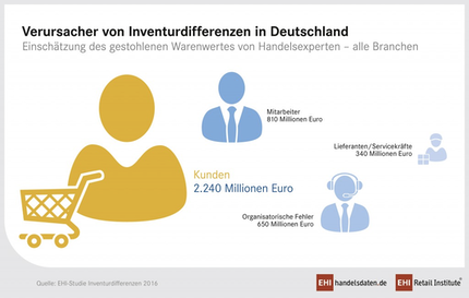Durchschnittlich beläuft sich die Inventurdifferenz auf 1 Prozent vom Umsatz; bei den im Einzelhandel üblichen Margen kein Pappenstiel. Dazu kommen Gegenmassnahmen des Handels durch Investitionen in präventive Massnahmen - Personal wie Technik (1,3 Mrd. Euro - Kameraüberwachung ist der Renner)- in Summe also 5,3 Mrd. Euro.