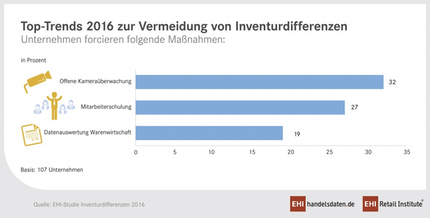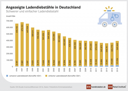 Das Kölner Handelsinstitut EHI sieht eine Zunahme im Vergleich zu 2014 um 100 Mio. Euro auf über 2 Mrd. Euro. Nicht zuletzt seien organisierte Bandendiebstähle für diese Entwicklung zuständig (deren prozentualer Anteil von rd. 25% belief sich auf ca. 250 Mio. Euro Warenwert). Die Inventurdifferenzen insgesamt summierten sich auf rd. 4 Mrd. Euro. Hierunter fallen die erwähnten Ladendiebstähle (ca. 55 Prozent), Mitarbeiterdiebstähle (rd. 810 Mio. Euro), Diebstähle durch Lieferanten und Servicekräfte; 640 Mio. Euro seien organisatorischen Mängeln geschuldet.
